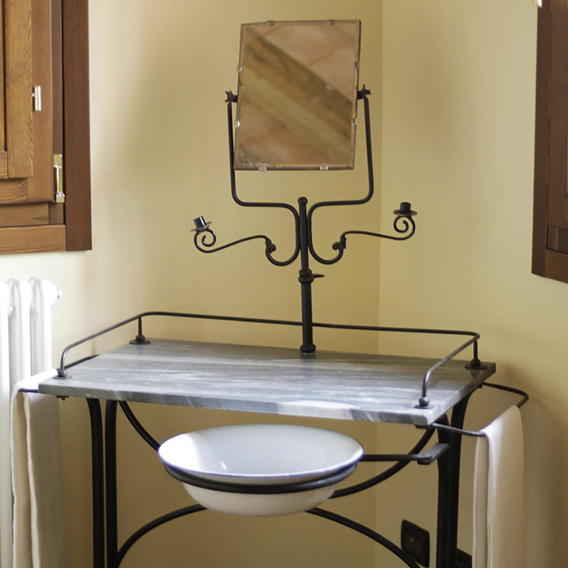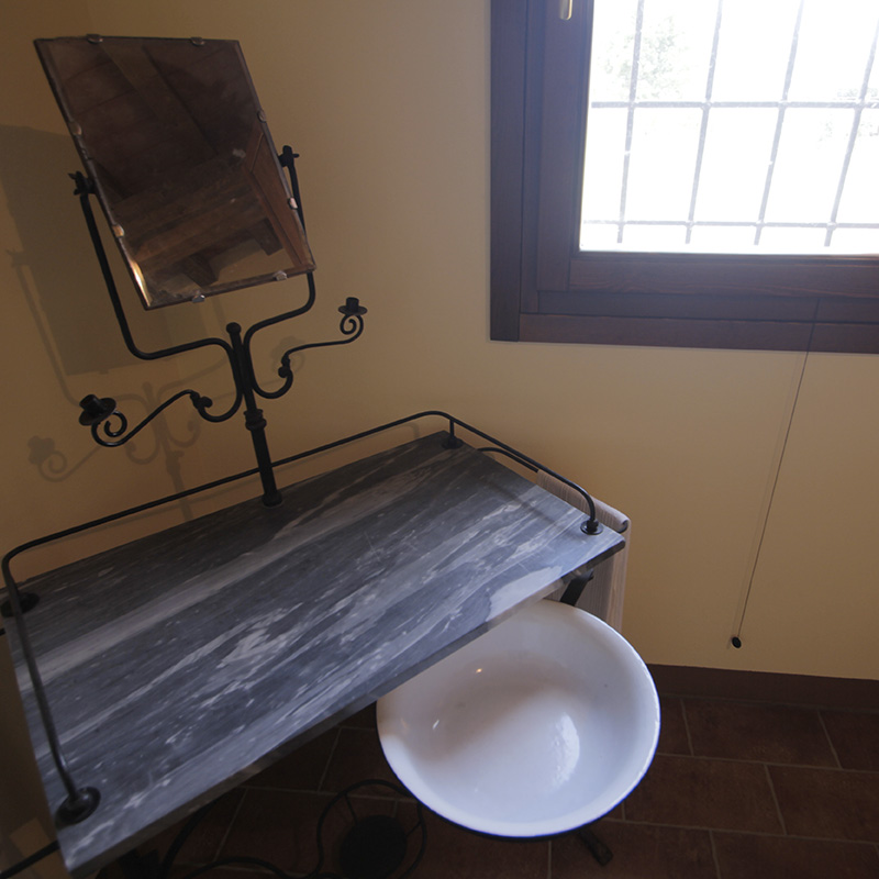 Al bagno si accede da un anti-bagno ottimo per raccogliere bagagli ed effetti personali. Le greche di travertino sono caratterizzate da pietre di color ambra alternate ad altre di colore tabacco.