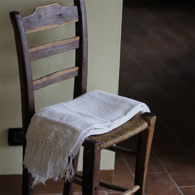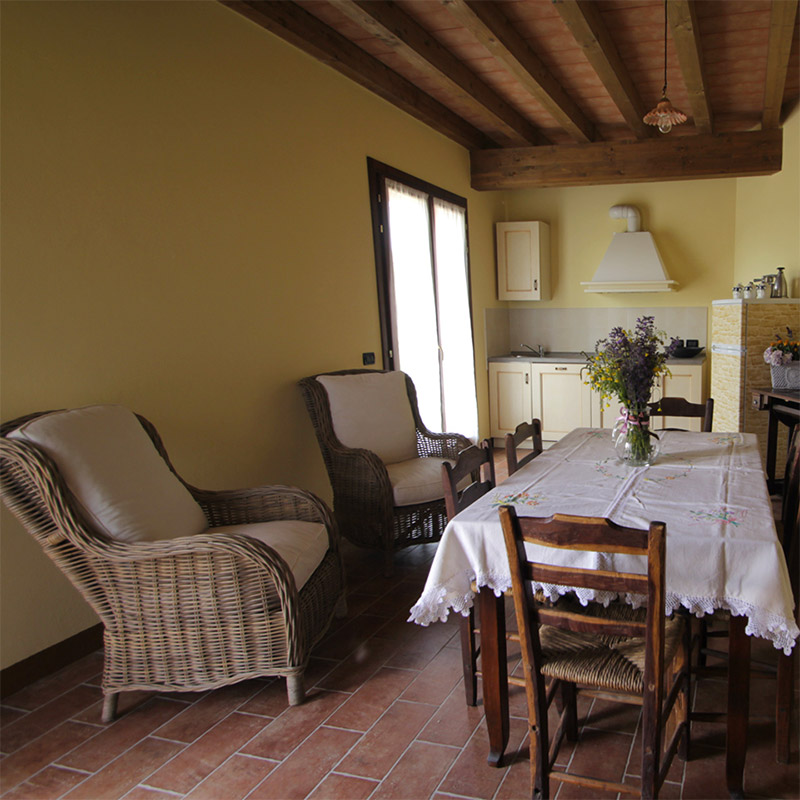 Gialle sono le pareti che scaldano gli ambienti del Grano, il soggiorno riceve luce da due ampie porte-finestre, e l’angolo cottura è dotato di lavastoviglie. Nel soggiorno si trova una vecchia madia con l’alzata di olmo della fine dell’800, con un comodo divano letto che si apre con estrema facilità. Gli ambienti sono illuminati da rustici piattini in terracotta naturale dipinti a mano. Ovunque cesti di paglia e vimini accolgono colorati mazzi di fiori e rose secchi.